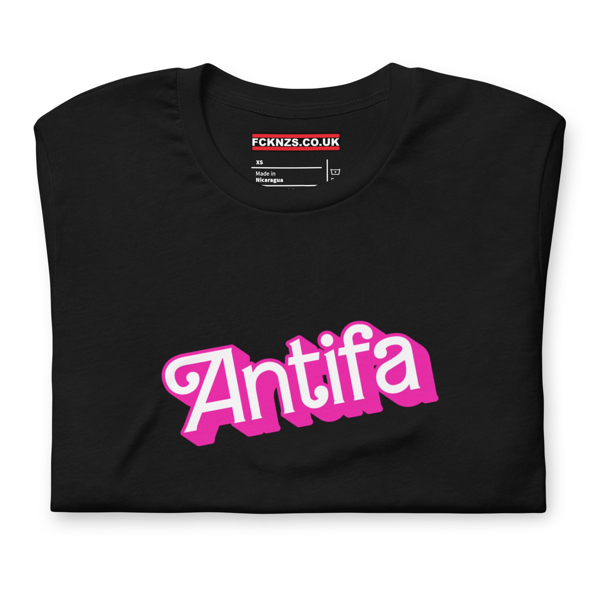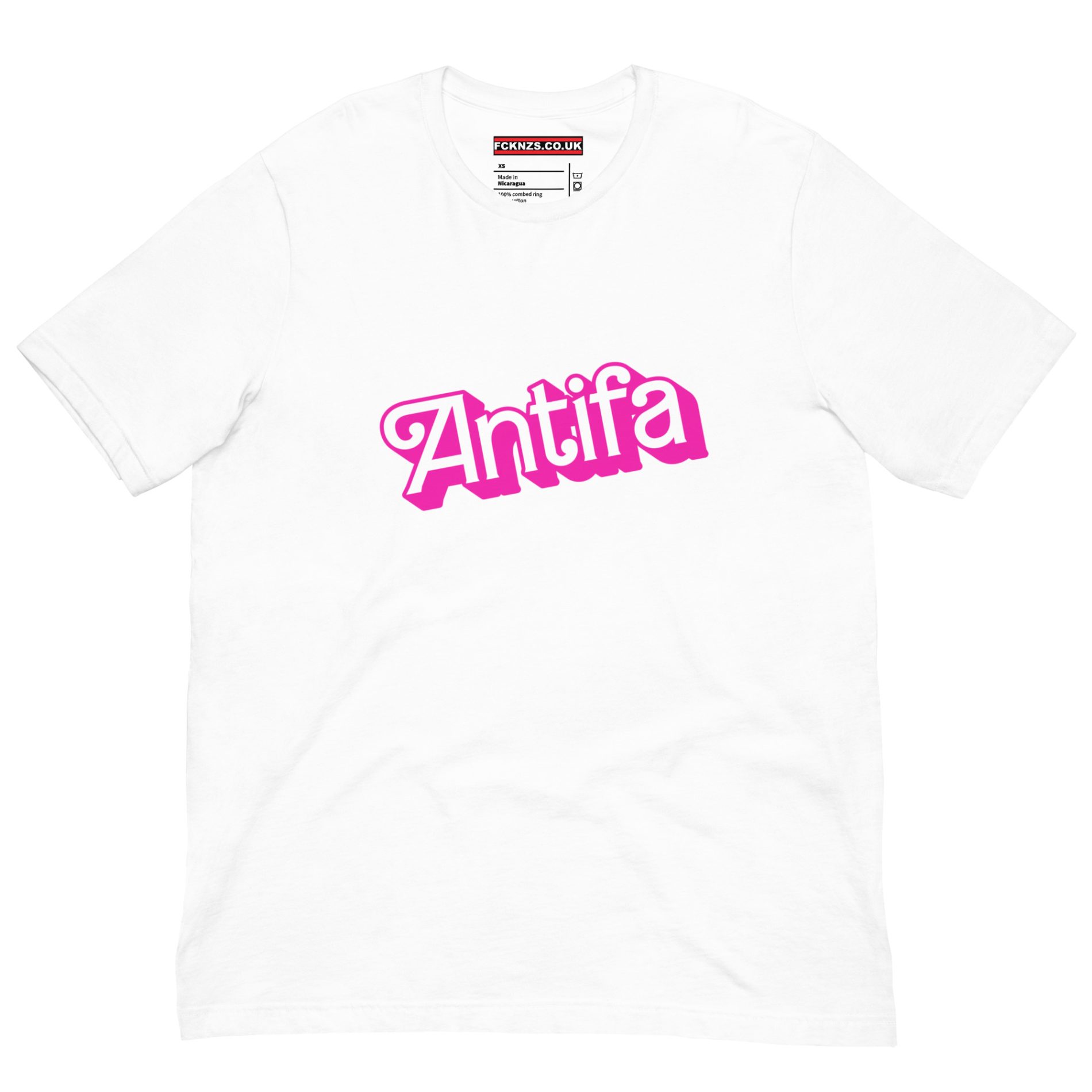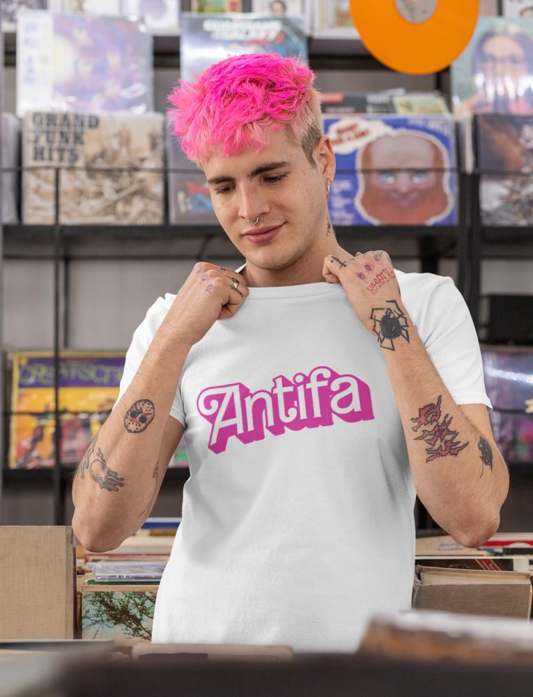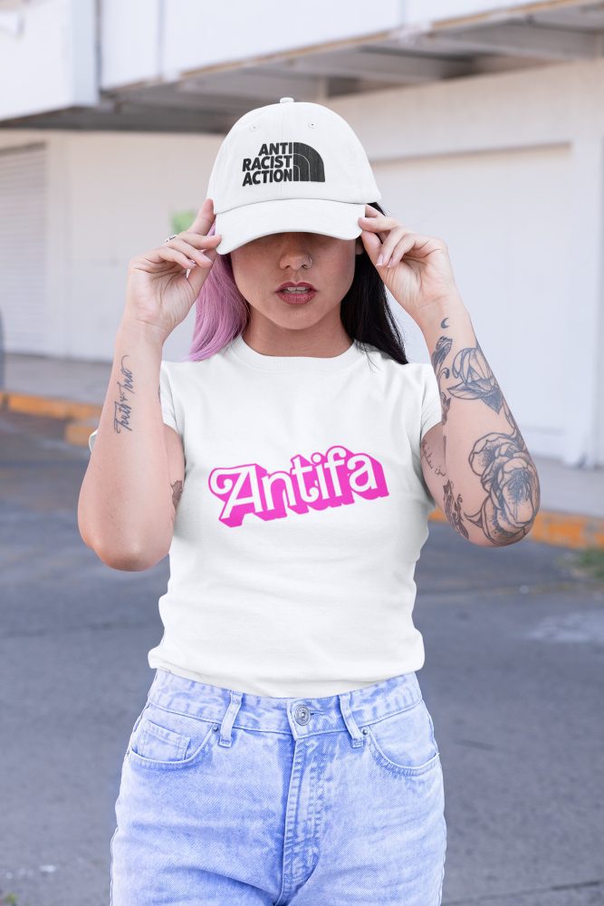 Ethically made. Boldly worn. The Antifa Barbie Tee is antifascism with attitude—because smashing systems looks better in pink.