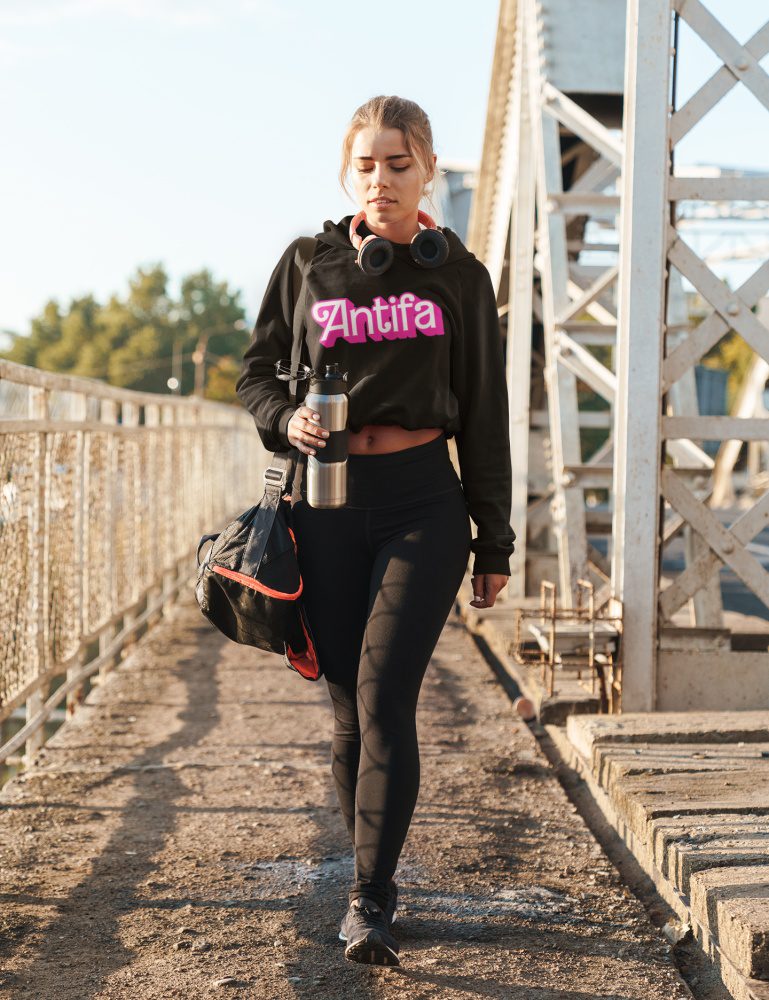 The Antifa Barbie Women’s Cropped Oversized Hoodie brings together rebellion and style in the most unapologetic way. Designed for those who fight fascism with both power and personality, this hoodie turns the pink aesthetic into a weapon of resistance. DTF print.