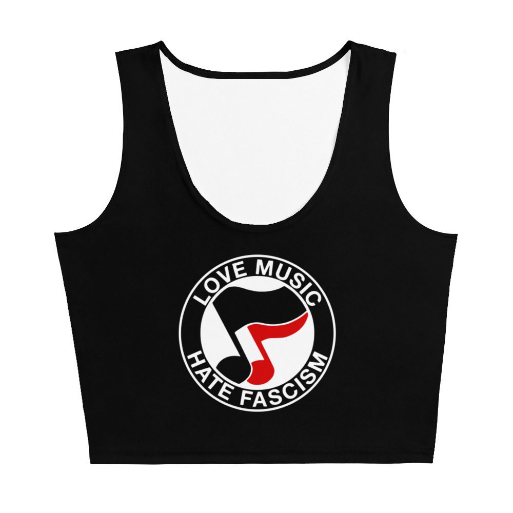 The Love Music Hate Fascism Crop Top Vest celebrates the power of sound and solidarity in the fight against hate. Inspired by a legacy of protest and unity through music, this top is made for those who turn up the volume on resistance and equality.