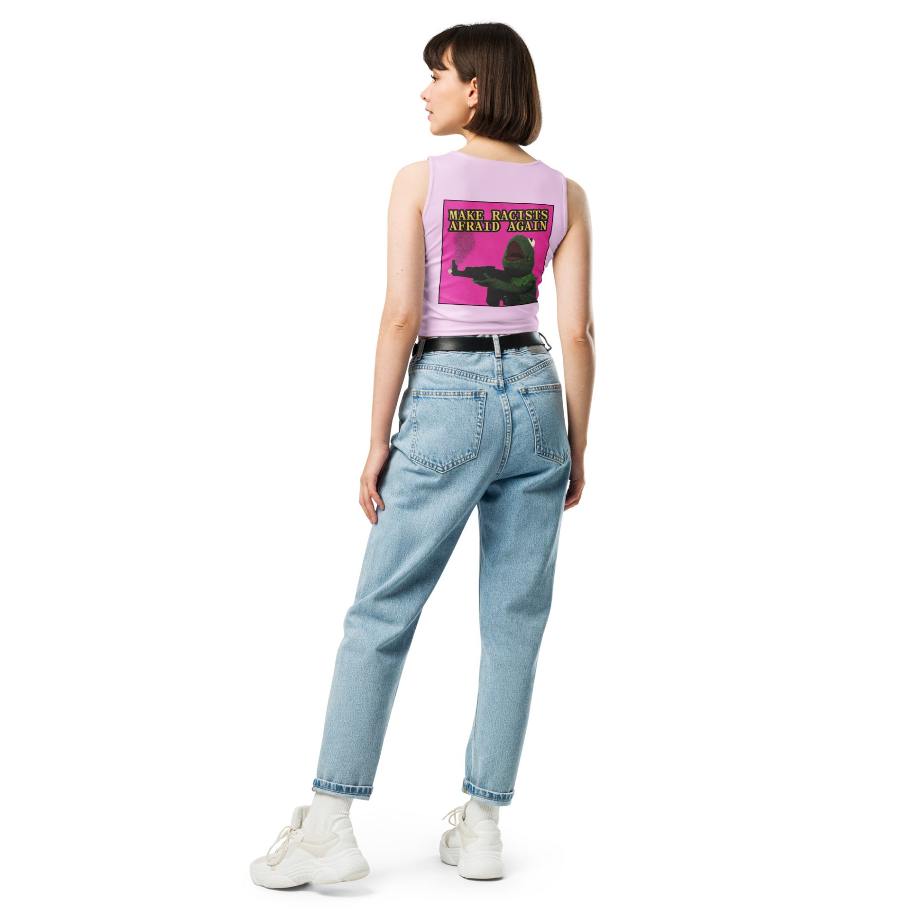 The Make Racists Afraid Again Crop Top Vest combines bold activism with unapologetic style. Featuring the iconic Kermit design – the green frog holding a gun on a striking pink background – this piece turns humour into resistance. Made for those who fight hate with attitude, it’s a fearless statement against racism and fascism.