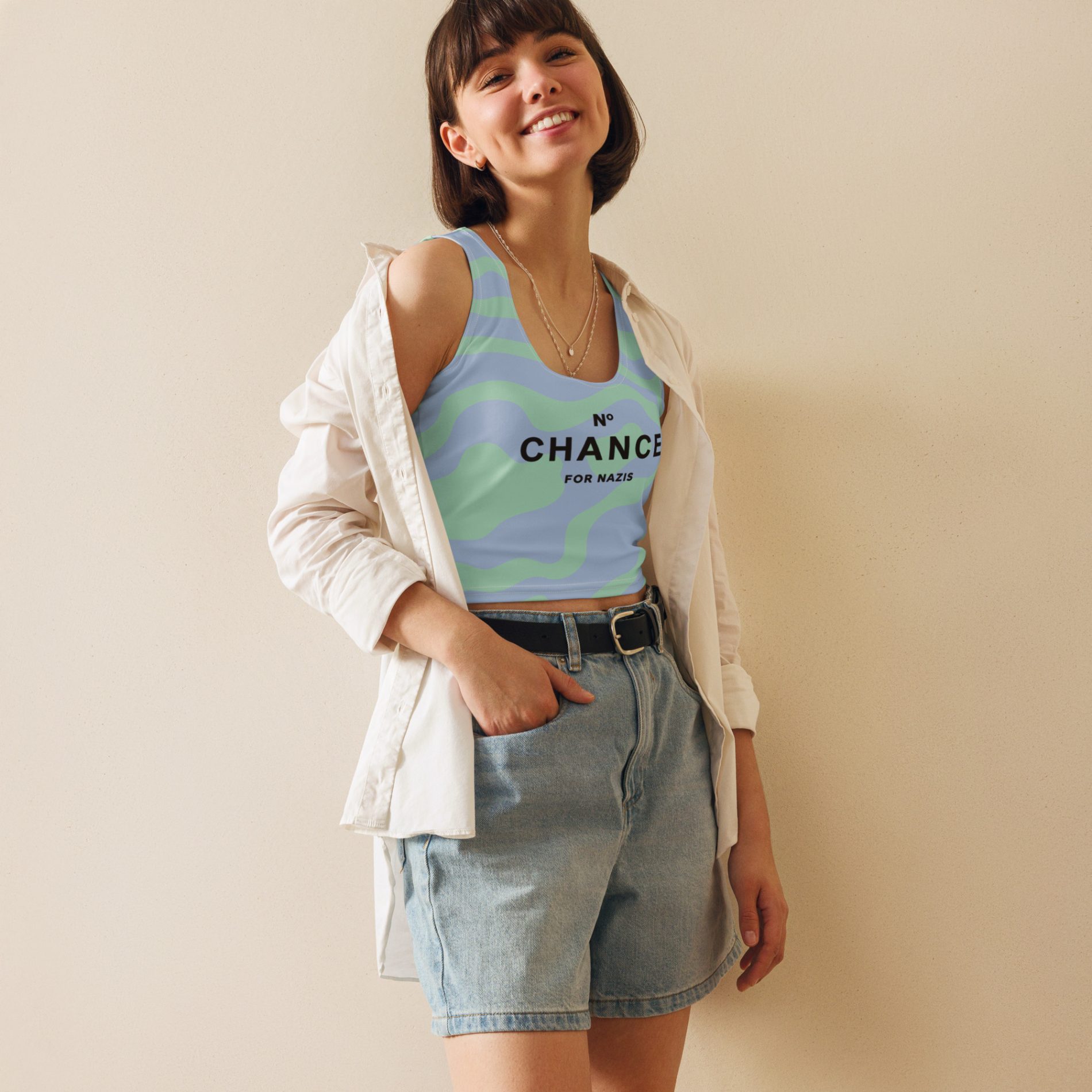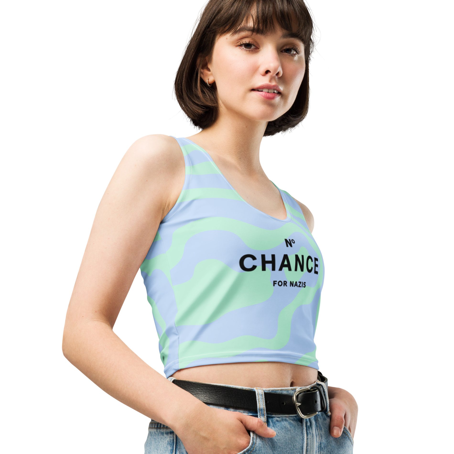 The No Chance for Nazis Crop Top Vest combines a bold antifascist message with sleek, modern style. Featuring a clever design parodying a famous perfume, this crop top makes it clear — fascism has no chance, anywhere.