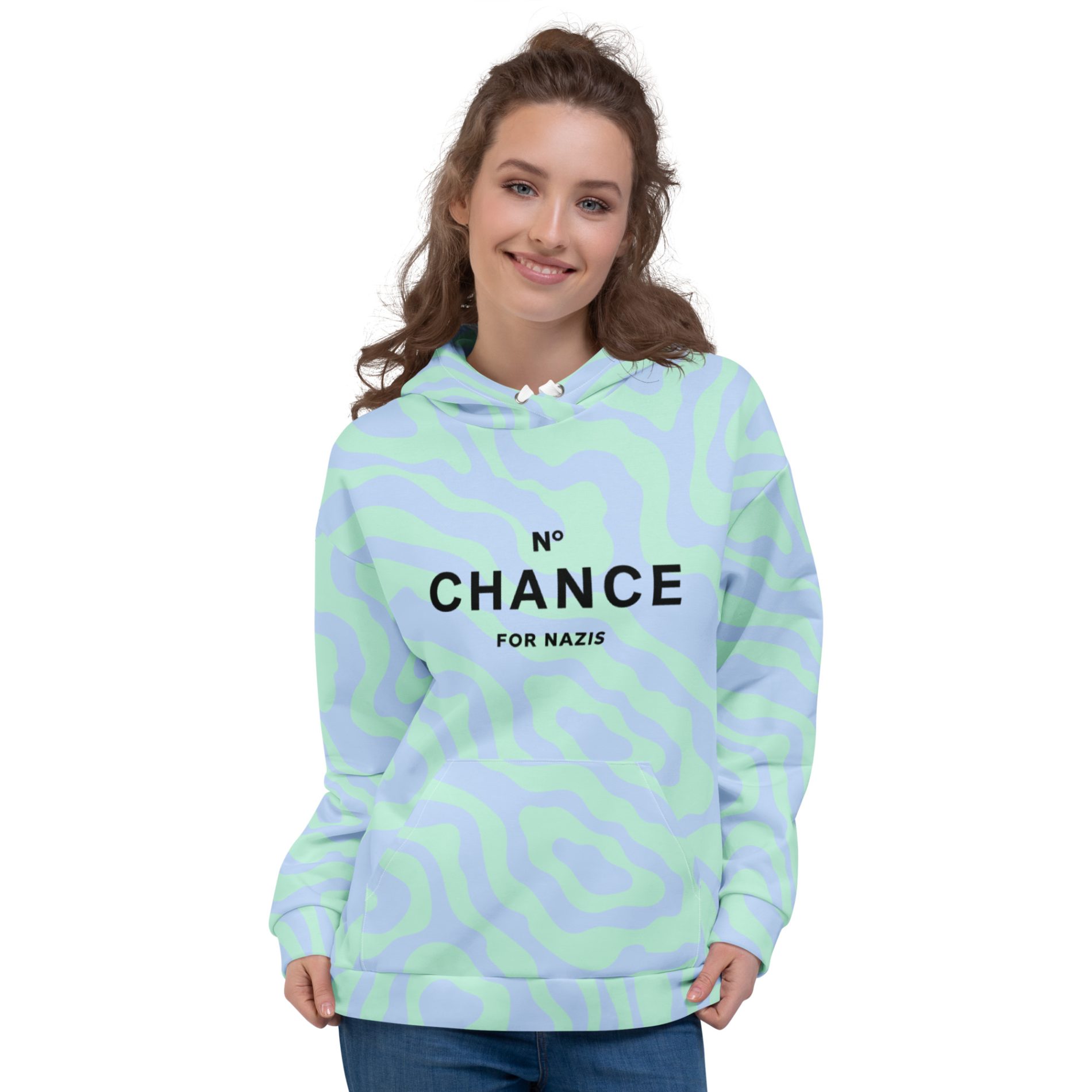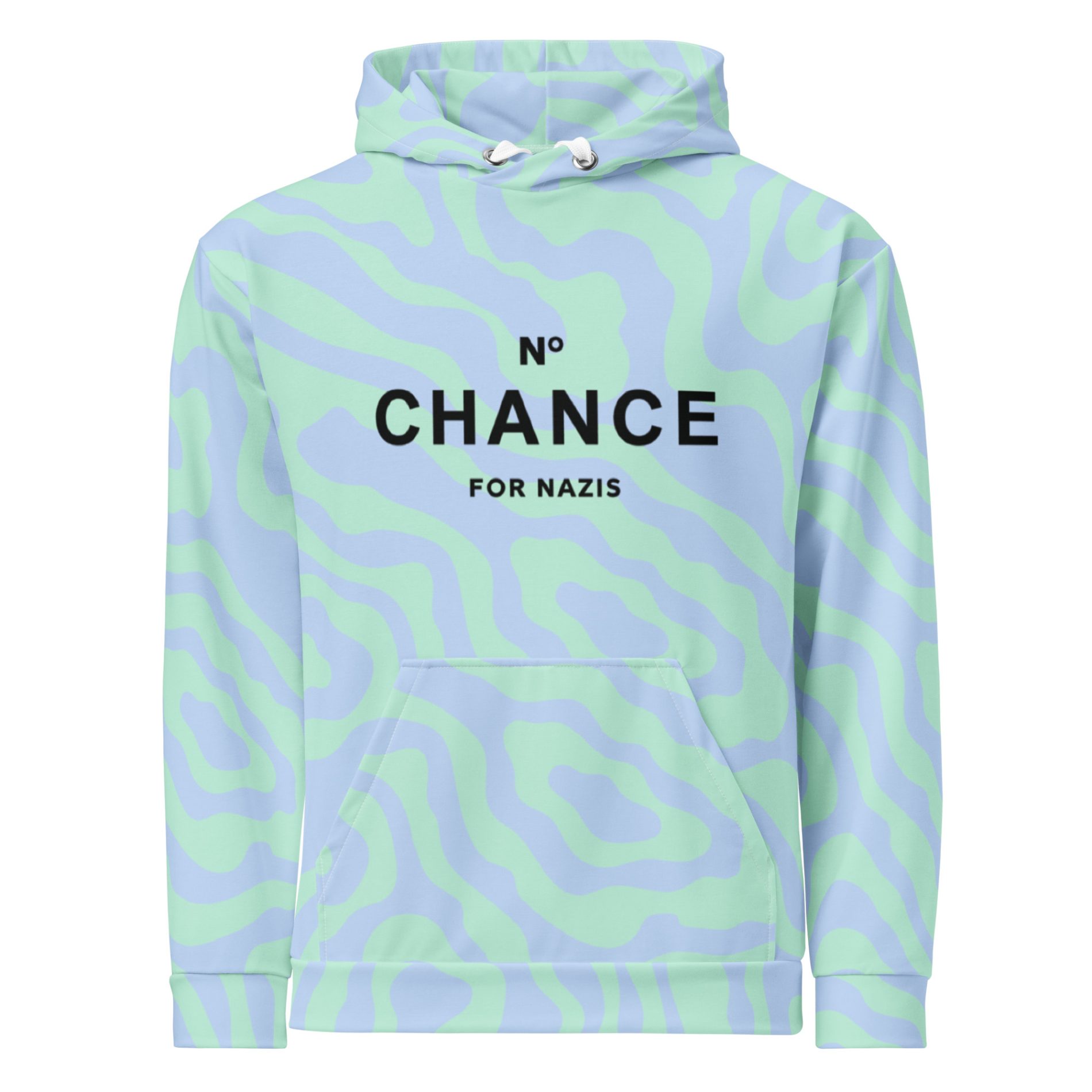 The No Chance for Nazis Unisex Recycled Hoodie delivers a strong antifascist message with a sustainable edge. Featuring a clever design parodying a famous perfume, this hoodie makes it clear — fascism has no chance here.